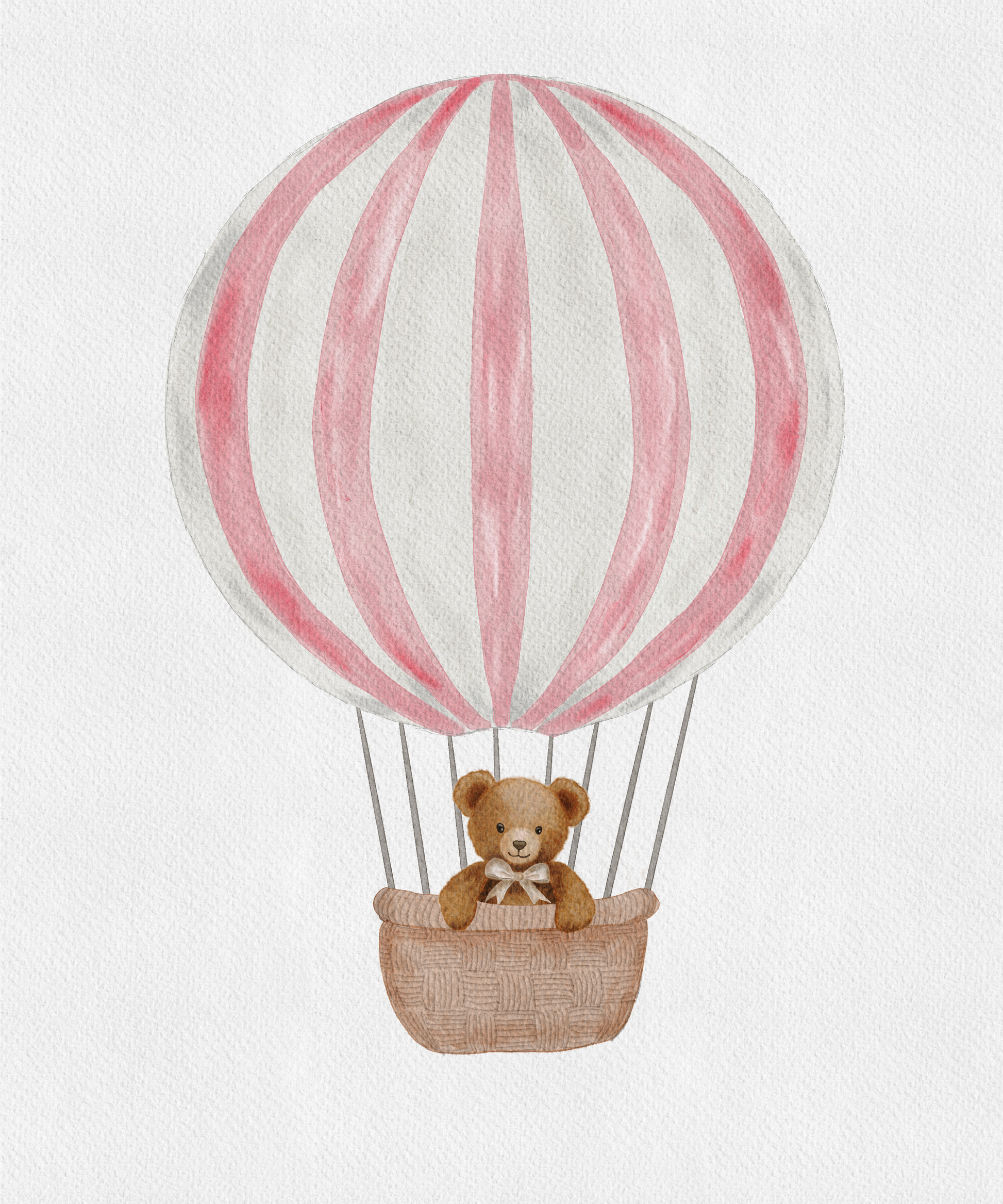 This watercolor print captures a teddy bear drifting peacefully in a hot air balloon, rendered in serene pink hues. The delicate brushwork conveys both warmth and whimsy, making it an ideal addition to nurseries or children's rooms. A refined piece that celebrates imagination with understated elegance.